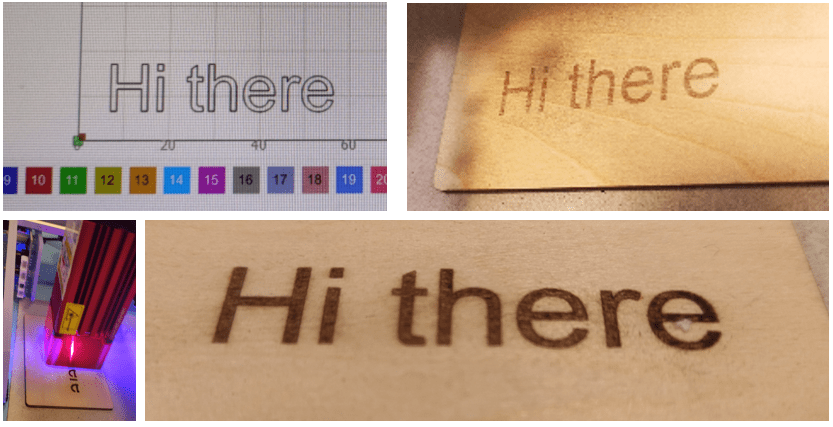 So THEN I tried the short focus, more powerful laser LU2-4SF at exactly the same settings (second “Hi there” above) – I invite you to compare the results. For general light wood engraving I’m happy with the second result as-is. No goggles were needed with this laser as it has a magnetically-mounted protective section at the bottom (no idea why it isn’t green like the goggles). Note the darker “Hi there” just above – in the short time since puting that up here (and similar engravings using my Ortur LM2 Pro) I’ve learned more. pasting dissolved Borax onto the wood before engraving can darken the brown to nearer black – see ADDENDUM for more. Also – the slight burning around the sides – use of air assist helps eliminate that. I’m awaiting a cheap pump delivery for the air assist. I’ll go into more depth on all of that later, probably in a separate blog entry.