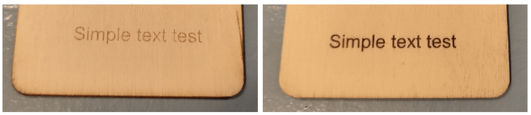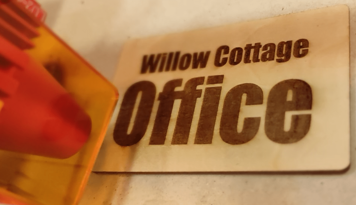 I left the piece of ply to dry for 20 minutes while I prepared some text on my Ourefo Laser One (and made some coffee for me). I set the laser to 50% power and 6000mm/minute – single pass. Look at the text below-left – it looks a little lighter than my very first “Willow Cottage” engraving you see further up – the tag I made – same wood. Well, it would as I made that first engraving at 100% power – same speed.