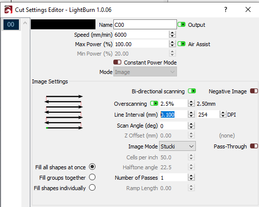 I found the default settings to be 0.1mm which is fine but it is possible to see the individual lines when engraving a fine image, so I altered that to 0.05mm – which of course slows down everything to 50% of the default but with that change there was a definite improvement in the image I was engraving.