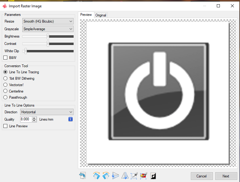 Oh, and if you don’t want to pay for software to use with one of these inexpensive lasers, then for Windows at least, there is LaserGRBL. As will become immediately obvious, I’m still learning here. Tonight I opened up LaserGRBL for the first time and imported a 48px*48px .png POWER symbol from my PC.