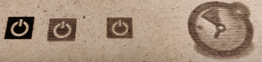 For the life of me I could not find any scaling or quality controls in the main LaserGRBL dialog, that is until I went back into the “Open File” dialog and paid a bit more attention. By paying careful attention to the options therein, you can adjust “Quality” lines/mm and more, then after hitting NEXT you can control power and size… to cut a long story short I started off with pretty awful results on a TIMER image then a POWER symbol but within minutes of tinkering was very happy with the little POWER icon (leftmost in the image below). See the second-from-left image – the lines per mm defaulted to 3 – I simply changed that to 10 and reduced the power from 100% to 40%. The material in case you were wondering was a pertty rubbish piece of card I use to protect my bench when engraving. And now, it’s decorated. After initially dismissing LaserGRBL I’ll try some text next (not immediately obvious) – or I may just take this new knowledge back to Lightburn (follow up – I did)..