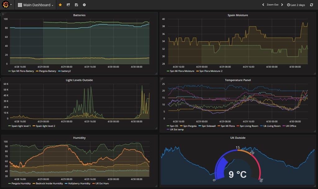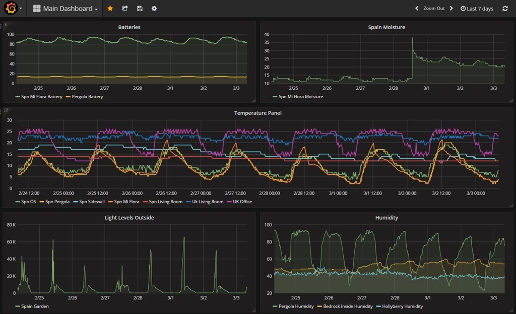 I also fed in some data from my general sensors – with horrible topics like pergola/lighting but of course thanks to the Grafana alias ability – names like that would not show up in Dashboards.