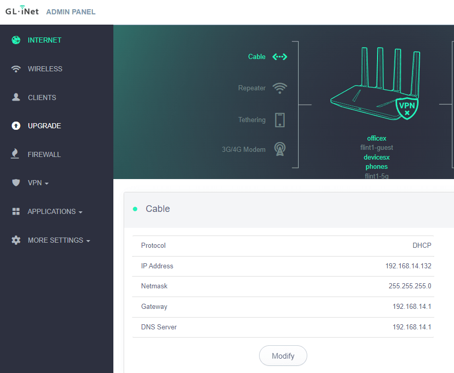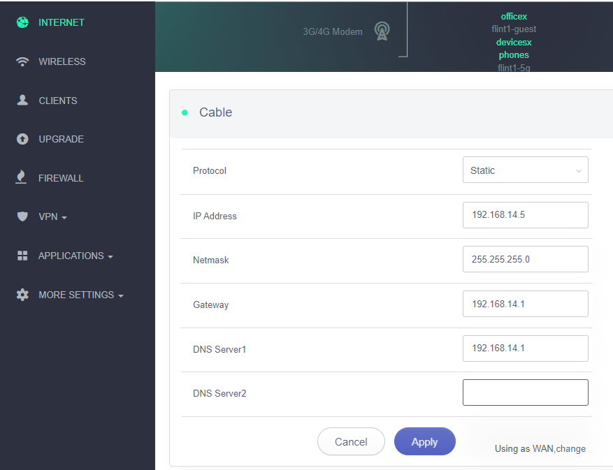 Flint (GL-AX1800), in a slight departure from pervious models, requires the user to set up a password for WiFi (rather than have a default password with the option to change) – which is only a problem if people leave in place the default password). I used the normal main WiFi and enabled it with my own password. In this case I needed the 5Ghz and 2.4Ghz Wifi to have different names so my phone would not “pick the fastest”. I called these “phones” and “phones-5g” respectively.
