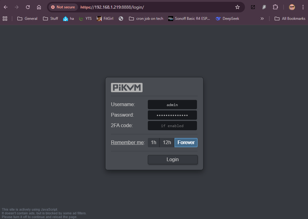 Oh here’s a thing – the KVM gets hot (not too hot to touch though). And when I upgraded the firmware to v1.50 – my PIKVM setting got lost. Easy to un-comment again in a terminal – (file location: /etc/kvmd/nginx-kvmd.conf)