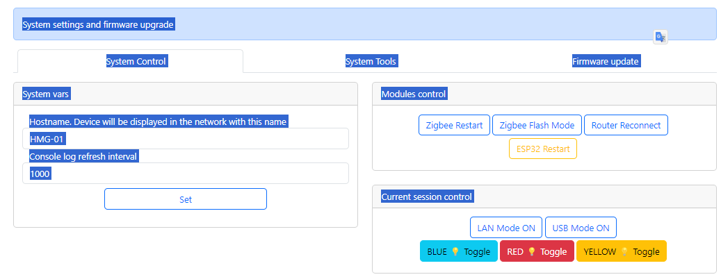 Erm, firmware update – choose file… No OTA update? It SEEMS that you can use USB mode or Ethernet mode and I assumed that router reconnect means you can put it in router rather than coordinator mode … and from the above you can clearly use it in WiFi mode if you wish. The unit is also obviously ESP32-based and can handle Zigbee2MQTT or ZHA. You can also change which port these use. That last top-panel LED will light up when Zigbee2MQTT is talking to the unit and Vice-versa.