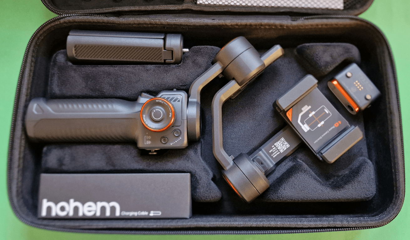 It turns out I won Hohem’s recent prize draw and in front of me I now have the M6 Kit. The KIT comes complete with the clamp-on “magnetic fill light and AI tracking sensor” (sitting on top of the phone clamp, below).