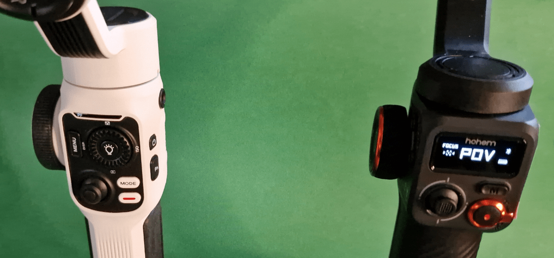 The Zhiyun Smooth 5S is similar in size to the M6 and both of course are much larger and more expensive than the Powervision S1 or Hohem V2 and the Zhiyun comes with two editing packages (well, 1.5 as you have to pay to use all the features of the second APP) but the Zhiyun does a much better job of grabbing my phone securely (even with a USB adaptor on the phone for external audio) and of course features built-in lighting.