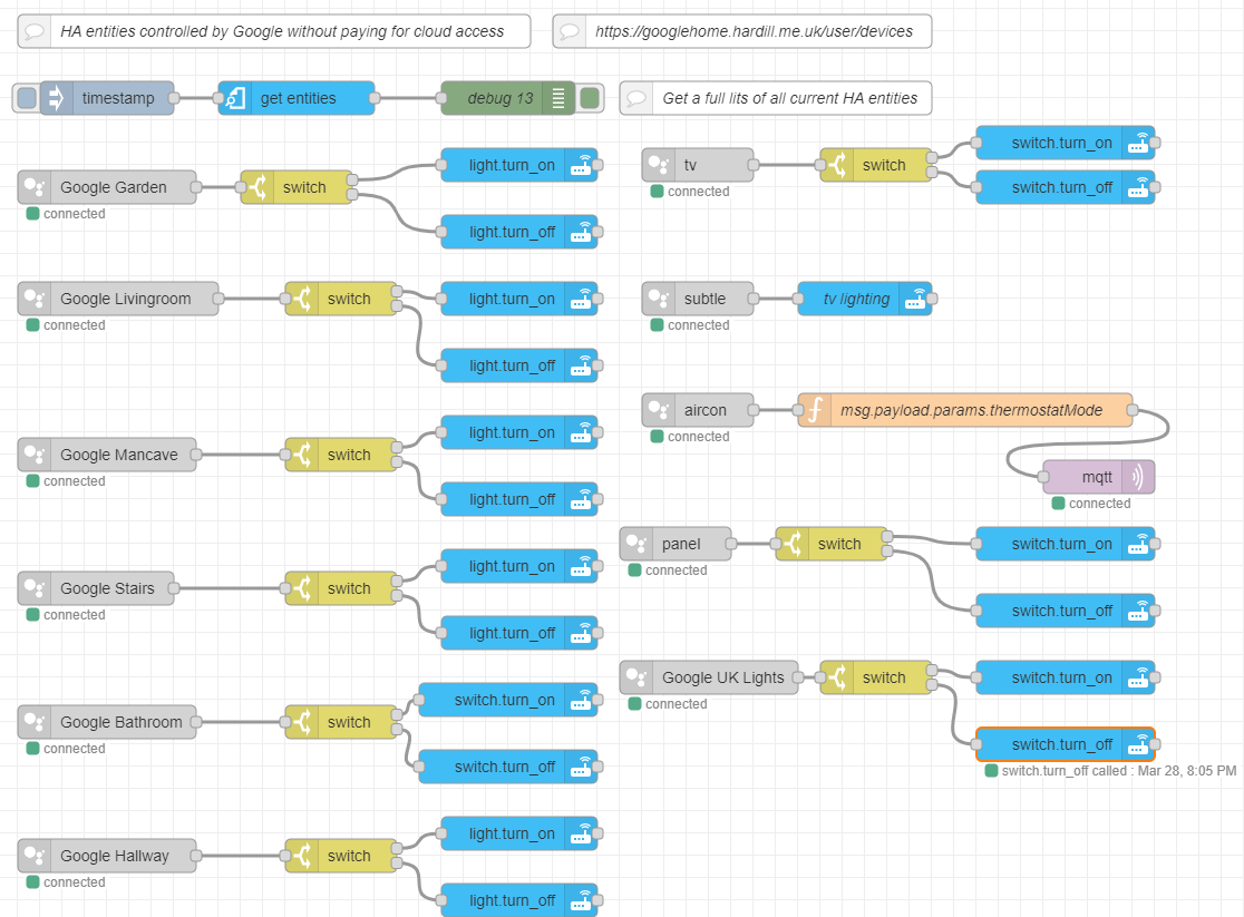 Typically my wife will say “OK Google, please turn on the livingroom” whereas I have it down to bare minimum “OK Google, livingroom ON”. Because of the limits of home-red-contrib-home-assistant-websocket or my understanding of it – I’m limited in the commands I can send (I see nothing like light colour control for example). I could fire off MQTT commands to Home Assistant for Google but I don’t quite understand what to send in various scenarios right now.