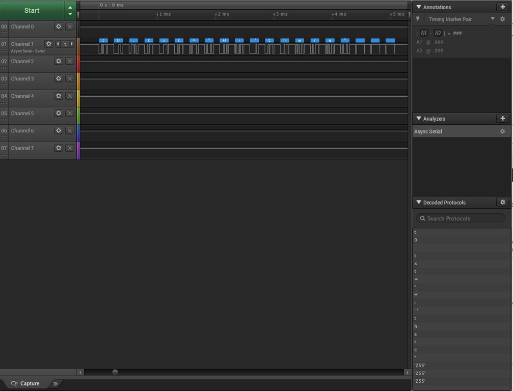 You can click on the image for a larger version but if you refer to the bottom right – you’ll see the message has been picked up by the logic analyser and it is fully intact with the three FF bytes inserted on the end for the Nextion display.
