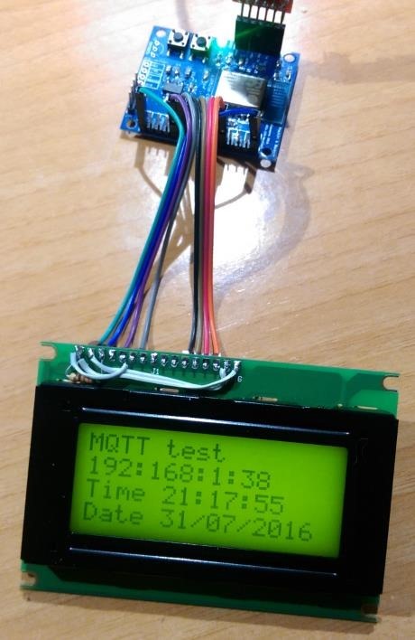 So what you’re looking at there from top to bottom – is a prototyping ESP8266 board (the author will recognise it) just because I had it handy – ESP-12 based, running my rapidly developing software (which now has loads of spare RAM thanks to the SDK 2.0). I put a simple set of i2c commands in there then promptly realised that a series of commands sent by MQTT would not be a lot of use. I then proceeded to waste the day, having already talked successfully to an 8-bit port expander, trying to get one of those back-of-an-LCD I2C boards to work – as it was based on the same chip.