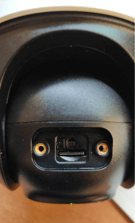 There’s a rubberised reset button covering a little compartment below the lense wherein you can open up and insert an SD card for storage of automatically made, movement-based recordings.