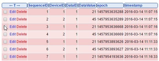 INSERT INTO Data(epoch, DeviceID, DataID, DataValue)Values(1458756676951,(SELECT DeviceID from Device WHERE DeviceName = ‘BedTemp’),(SELECT DataID from DeviceData WHERE DataName =’value’ AND DeviceID =(SELECT DeviceID from Device WHERE DeviceName = ‘BedTemp’)),22)
