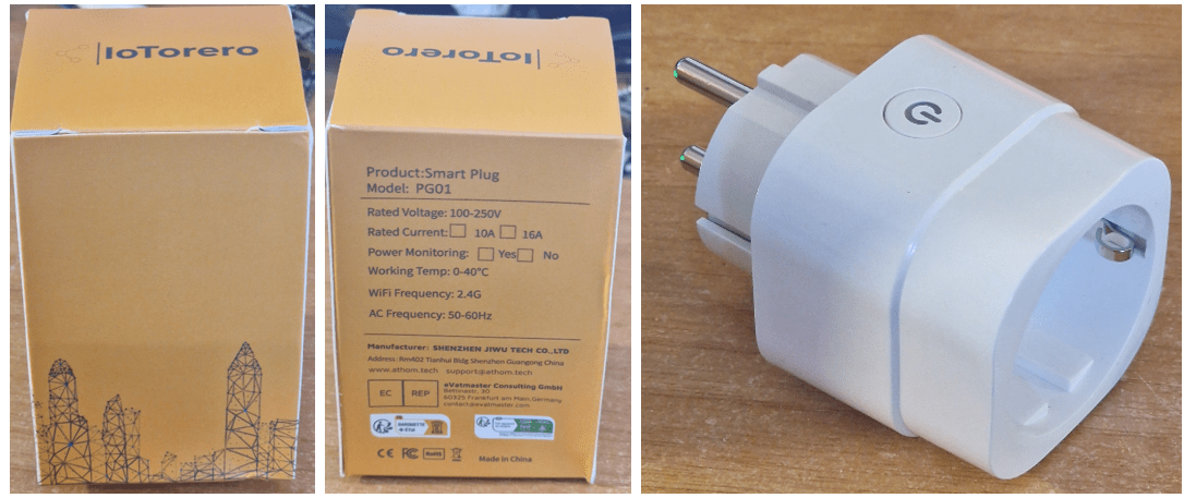 So, the plug arrived by normal post today here in Spain only days after ordering it. The box reminds me of the original Athom boxing – but in this case it states that this is the IoTorero PG01 plug, 100-250v – rated current – well, 10 or 16A, no-one ticked the relevant box, same with power monitoring – could be or not. Standard 2.4Ghz WiFi, 0-40c working. Tasmota inside. Manufacturer Shenzhen Jiwu Co., Ltd.
