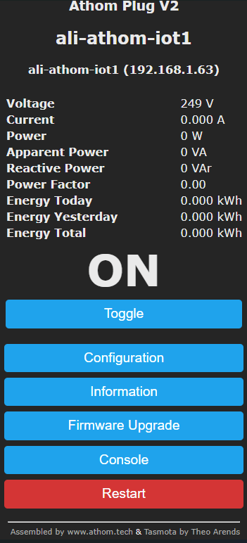 All done… it IS power monitoring for I think just under 11 Euros ALL IN, not bad. The next thing to do was to find out if this is old or new…. and that’s what the information page is for. The chip is an ESP8266EX with 2048KB of FLASH. Dooe enough for what this does – you’re not going to be sticking all sorts of sensors on it as it is sealed. Tasmota 10.1 – well, I couldn’t be having that, so in at the deep end, I went off to the update page FIRMWARE UPGRADE and simply hit the top UPGRADE button. You have to be patient as it does a 2-part online upgrade.