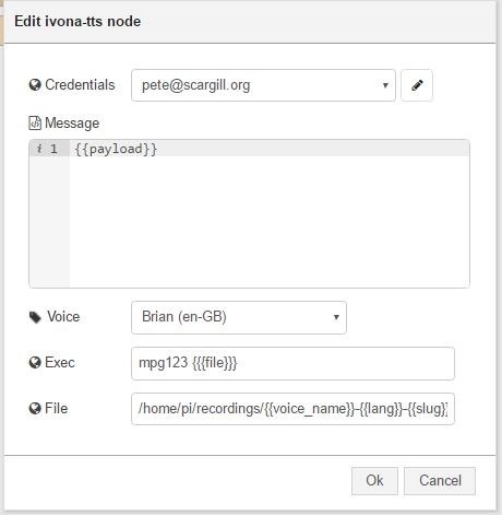 So here is the MK 2 explanation of how to use the Ivona Node-Red node – this time with the benefit of having actually read the instructions.