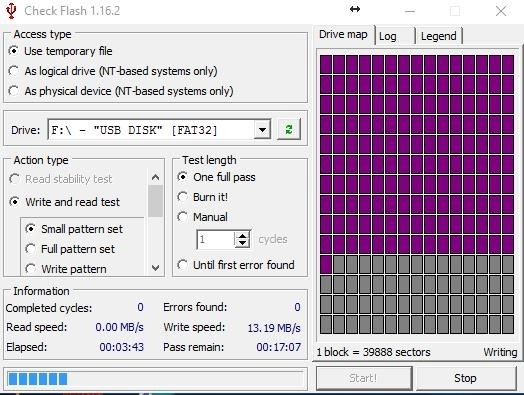 So – the first thing I did was to grab my favourite, fastest 32GB USB memory stick – a Duracell unit. I ran the test which took several minutes – and what did I get? 19 MB read speeds and 13MB write speeds – no errors. I know it is the fastest one I have as I often back movies up to it and when you’re backing up a 2GB movie – you soon make sure you use the quickest drive.