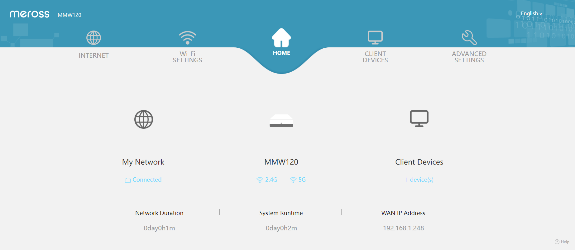 My phone SHOULD have seen two Meross access points – a 2.4G and a 5G access point. In fact it saw MERROS_MW_4629 only but that’s due to the combining function in my phone. I connected no problem. I then pointed the phone browser to 192.168.58.1 as instructed. On the top right I noted a language selector – default was German – this was easily switched to English.