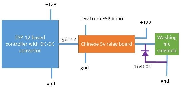 I know, sounds daft, so I put a diode across the washing machine solenoid – something I should have done in the first place. Immediately – 100% perfect operation tested over and over. Worth knowing about. See purple diode below.