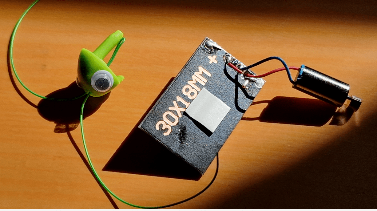 First on the list – a solar grasshopper. Marvelous idea for a toy to annoy the cats… the grasshopper works (worked) in the sun on any smooth surface (it does NOT work on a tablecloth). I’ve included a couple of pics at the top to give you an idea – what do you do when you’re factory is short of useful things to do, have some spare plastic, some old phone vibrators and solar panels lying around?