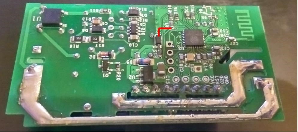 See that red line – that’s the best I had come up with until now – shorting these points VERY carefully when applying FTDI power to the board (don’t for HEAVENS SAKE even THINK of doing this with the mains attached) to trigger programming mode. See the 4 way set of holes in the middle – that is ground, serial, serial and 3v3 (the square pad is 3v3). I used an FTDI with a 3v3 output which had just enough power to run the board and program it.