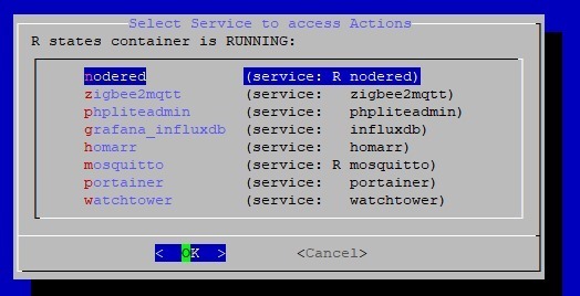 i added a menu to manage all this stuff, actions menu once selected a service has just the actions based on the container status (on main menu, an R means container is running): so you can’t run start on an already started container, or logs or bash on a stopped one