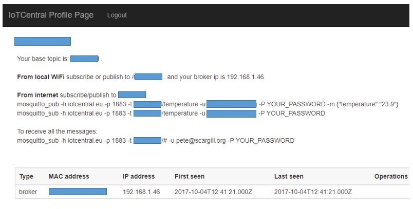 To test this I shut off my router from the outside world – and reset the ESP8266. I could not, no matter what I did, connect to the local ESP8266 broker. My normal Raspberry Pi-based MQTT broker sprang back to life almost immediately and the browser connected to that. The ESP8266 broker however remained dead. I reconnected the outside world – but the ESP-8266-based broker remained unavailable. I reset the ESP8266-based broker – and nothing. When I looked on the IOTCENTRAL site – the router had changed IP addresses. I’ve had an email that said this