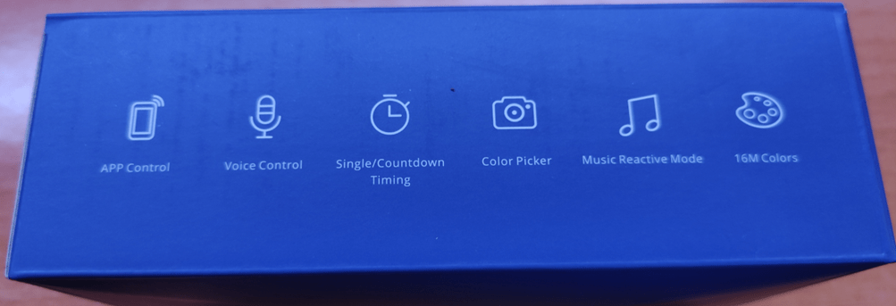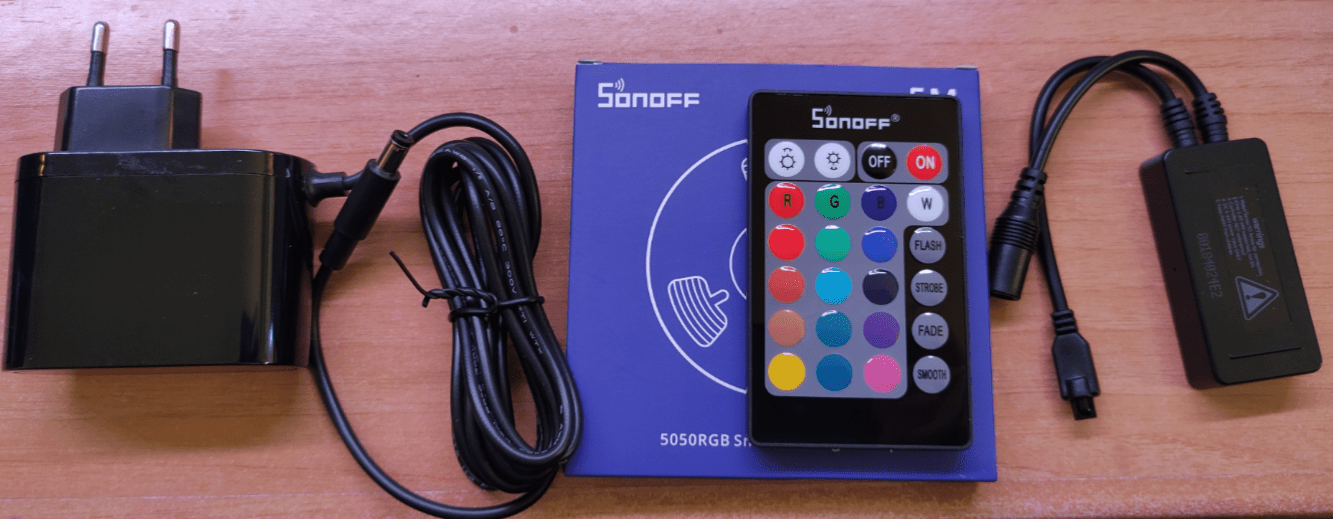 The photos above and below pretty much say it all – 5M of LED strip, mains power supply, IR Remote + controller, all in one box, ready to go complete with voice control and more if you use the EWELINK App on your mobile phone. In case it isn’t obvious, that IR remote allows fading, flashing and steady colour control.