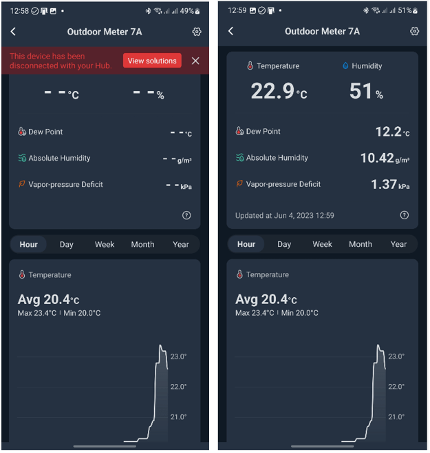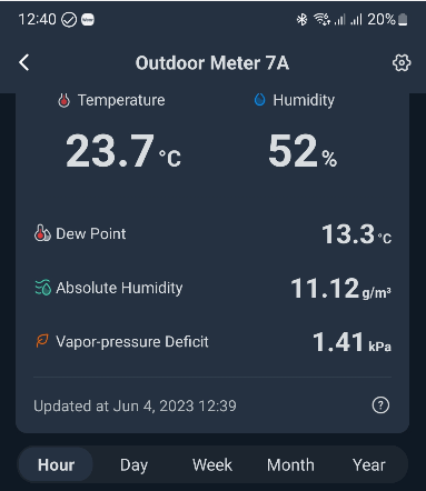 I put the sensor outside half an hour ago (in the open-on-two-sides pergola) and now according to my phone which is inside the house, in my office – “Your device has disconnected from your hub”. The small, white (and particularly unstable on the bench) Switchbot HUB is in also my office. Oh, well.