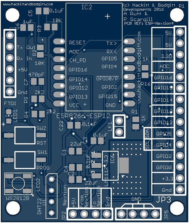 After a slight hiccup with the new board (LED track missing) here’s the new board – link for PCB here – as you can see, Aidan has made several improvements – smaller buttons, connector for DHT22 etc, markings for I2c (right now I only have support for the 8-output expander discussed elsewhere but more will follow as time permits) and general tidy up. Both the original LED and the new RGB LED are included – personally I find coloured lights for status a lot more useful than a flashing light – but of course they can use more power. As well as the LCD project this board has become a general purpose ESP-12 board and I now would not use any other. We’ve not wasted cost putting USB on it because FTDIs are cheap and that reduces the end cost of the board. The link above has all the files – please note we’ve NOT had delivery of these, the previous version was almost the same and works but for a track on the WS2812b.. so it is highly likely this board will be just fine – will be a couple of weeks or so before we know (delivery from China) and another week before I get my hands on one (Aidan is in the UK, I’m in Spain). The I2C markings are just to make it easier to remember which pins you use – we didn’t have enough room for yet another 4-way connector. If you are looking in for the first time – see the Nextion WIFI Display blog and the Home Control 2016 blog.