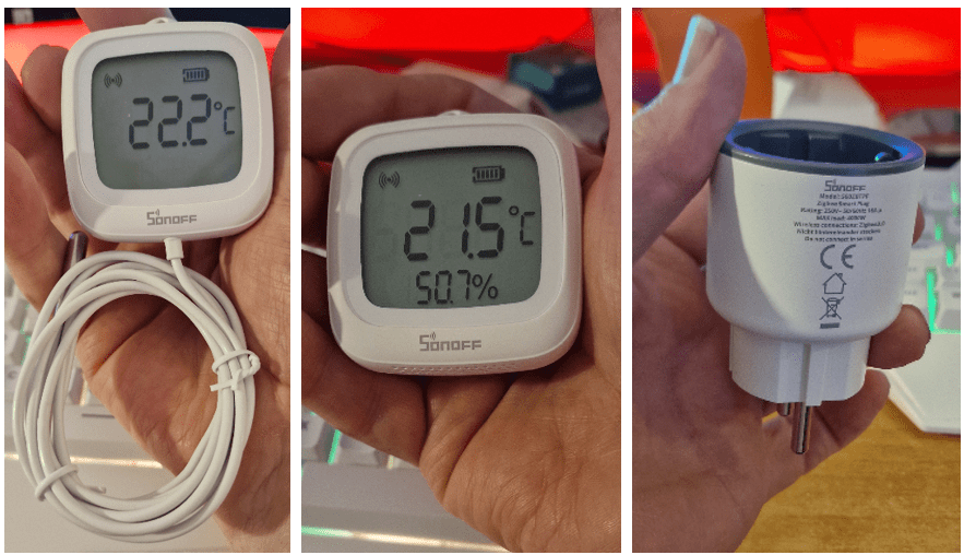 Next: The Sonoff SNZB-02LD and SNZB-02WD. The former has an external sensor (waterproof stainless with a Dallas chip hence supporting temperature only – the latter does temperature and humidity. Both look substancial and waterproof and use a CR2477 battery. Both come with a lanyard.