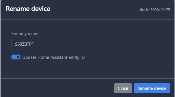 Seconds later the usual incomprehensively long number popped up and the device was also identified as an S60ZBTPF – so – I renamed it and updated the Home Assistant entity ID as below.