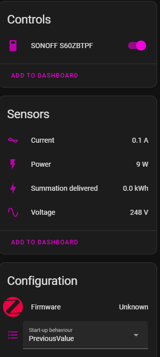 Nothing else – that seemed to be it… a straight forward energy monitoring smartplug. Now, on the box is the ability to overview energy use, inching and other modes but at least for now these do not appear in Zigbee2MQTT.
