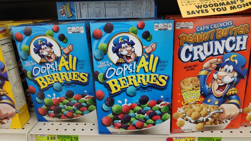 I intend to make the best of my time here while continuing my reduced-quantity diet. Crunch Berries, All Berries, Peanut butter Crunch, Lucky Charms, Cocoa Pebbles, Fruity Pebbles, Krave, Captain Crunch, Donut Shop, Froot Loops, Dyno-Bites, Tootie-Fruities, Trix, need I say more?