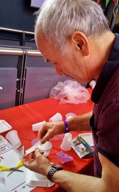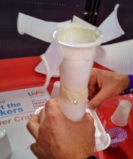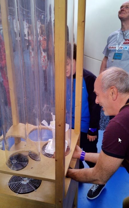 Next off we came across an interesting idea – a bunch of clear tubes maybe 12” diameter and 6ft or more high – with air blowing up them. The public was provided with cups. paper plates, glue and sticky tape and invited to design the gadget likely to