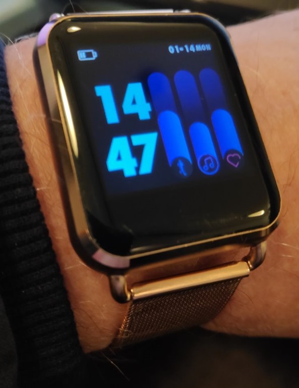The Newwear Q3 Plus is a metal gold coloured job – at least, mine is gold-coloured, goodness knows how long that finish will (or will not last) but I like it. Colour is good, charge life looking to be 3-6 days (I’ve not properly charged it yet – update day 4 – the battery monitor still says 30% – I may have underestimated this one), only 3 faces one of which is not for me, no blood sugar levels but it does everything else as per the ad below. Strap is properly adjustable so if you are no into the plastic ones you might like this. The App is called (no giggling) HEY BAND and despite the daft name is very easy to use – get it from the Playstore.