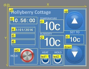 On the right we define hotspots for touch sensitivity – which COVER the various buttons and those hotspots can be defined not only to return a value when pressed but also to change to make use of the “crop image” feature of the Nextion – to show part of ANOTHER image when required – and that is the second image of the two above.