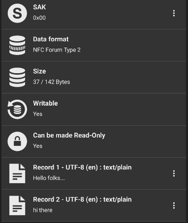 Lots of learning here… so in the screen left – partial info showing up in NFC tools on my phone after doing a random write using the new tag reader… see the last entry – that’s info I typed into NFC tools and the tag reader just wrote to my cheap tag. See the two records on the left?