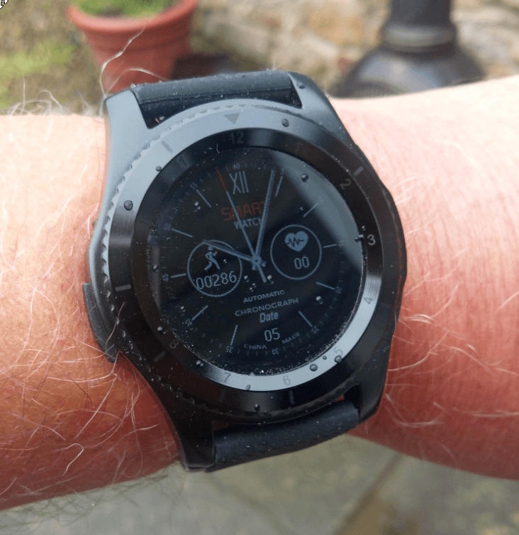 You get a choice of watch faces (not expandable) as you can see and mine came with both black and red straps. It has phone, bracelet and watch modes as well as a tempered glass screen.I’ve not tried yet but the claim is that you can leave your phone at home, put your SIM into the watch and use it to make calls. Far more importantly, the battery does seem to last a few days. Don’t confuse this with the likes of the Samsung Gear 2 Classic which has many hundreds of watch faces available (some free, the rest cheaply) but then that watch costs COSIDERABLY more than the NO 1. Here is a live action shot for Leo.