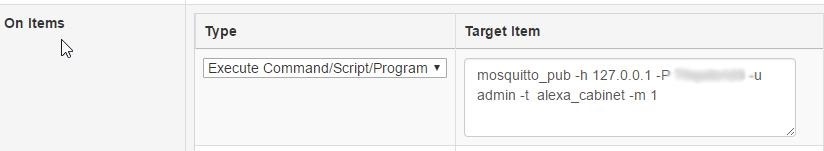 As you can see my password is blurred out. So Ha-Bridge on hearing “Alexa, cabinet on” or similar, sends a command line message to publish a message of topic “alexa_cabinet” with the value 1. For those unfamiliar with the mosquitto_pub application – P means password, –u means user, –m means message and as you can see I’m using a local MQTT broker (Mosquitto).