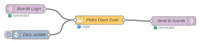 The Boards Login block is an MQTT subscribe block – standard. The Daily Update is a standard inject block – and the Send to Boards is an MQTT publish – against standard.