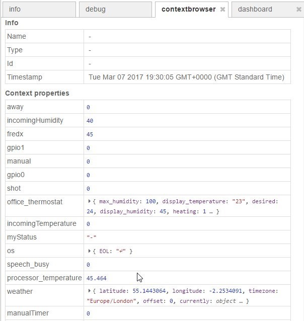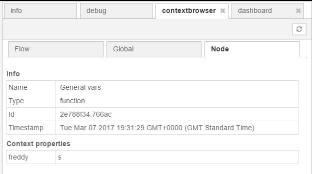 As you can see, you must select the particular node or function with the mouse first – then hit the little refresh in the contextbrowser tab – you then see above freddy and the value in the tab – along with any others you’ve defined in that node or function. Ok it’s not quite debugging but better than nothing.