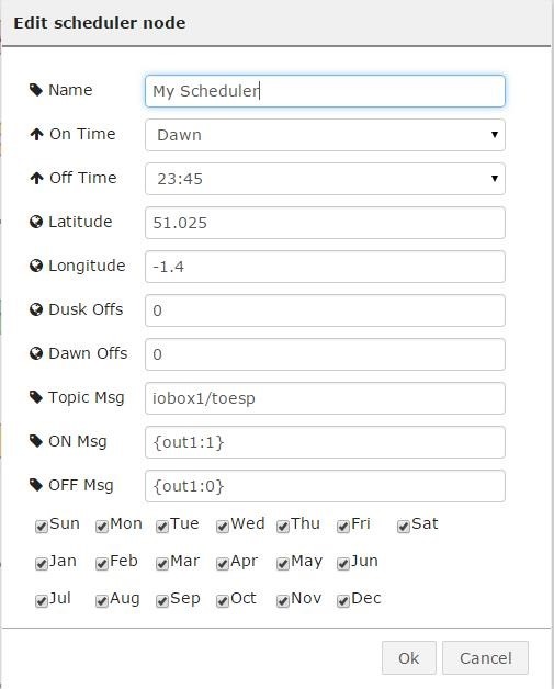 I’m Peter Scargill and this is a scheduler for Node-Red (well, more of a timer really but someone surely has already used the term timer) for Node-Red which includes days and months, dawn and dusk with optional offsets and a time-out mode, You may notice this has improved since the first version – I’m learning as I go along.