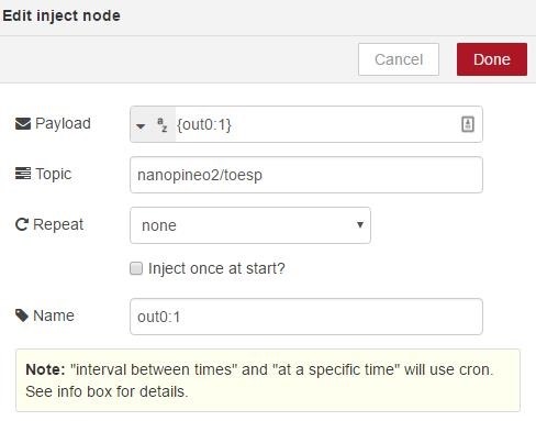 Simple enough. When pressed the node outputs a topic of nanopineo2/toesp and a payload of {out0:1}