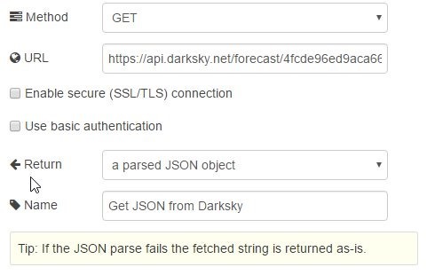 The “http request” node in the middle requires little information – just your unique code which you get when you sign up (for free) with DarkSky – and your longitude and latitude.