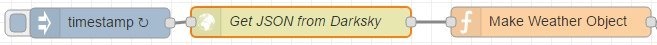 If you wish to “call” the DarkSky API you may do this up to 1000 times a day for free. Reader Jay and I felt that grabbing the information every 5 minutes might be a good start. Once the novelty wears off you might consider every 15 minutes or so. A timestamp node is simply used as a trigger – to get the information when Node-Red powers up and every 5 minutes from there on.