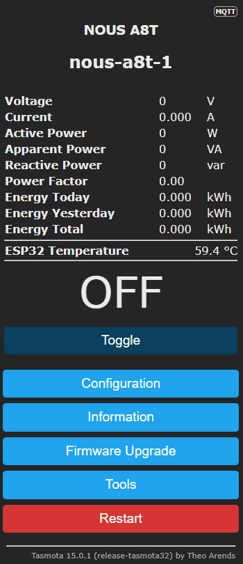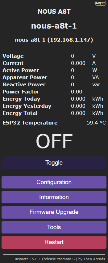 Note that the power monitoring is pre-configured. My device came with Tasmota32 version 13.3 and I could not stop myself from using the built-in OTA firmware upgrade option and moments later without touching anything, I had bang-up-to date Tasmota running on my new smartplug. (see at the bottom of the config image right “”Tasmota 15.0.1”