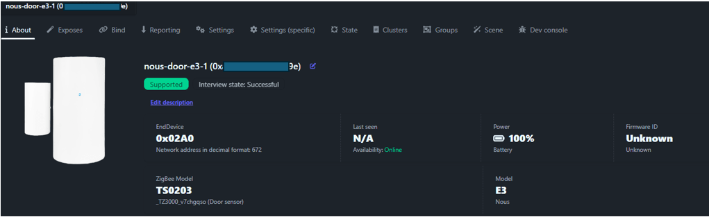 I opened the very colourful box to find the NOUS Sensor E3 device, magnet unit for the door or doorframe – and the realisation that this device uses another battery I’ve never used…. a CR2 – BUT they CLAIM up to 5 years life. Good start. I noted a small RESET button on the bottom of the device (and a blue LED visible from the front) – so no tools needed – anyway I could not resist having a look at the battery and the unit comes apart by hand only – no need for even a screwdriver. I took off the protective shipping tab attached to the battery and held the reset button in for 10 seconds after which I added the device to my Zigbee network – it joined quickly with another of those utterly unreadable long numbers which I quickly replaced with the name nous-door-e3-1 (my choice). The device exposes open/closed status, battery percentage and voltage. Simple enough. If the battery life is anywhere near what they claim – happy – if not – look back in here in X years time 🙂