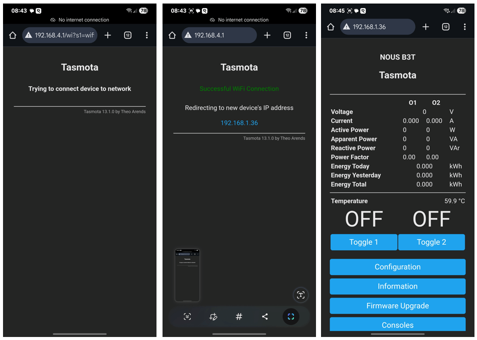 Off to 192.168.4.1 and select my nearest SSID. The B3T switches to that access point and my phone goes back to a normal access point and opens the main Tasmota page. Some text alignment issues there but I’m sure that’s out of Nous’s hands.