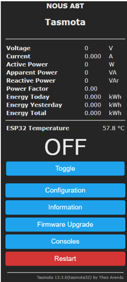 Once again we have temperature shown. But compare to the A8T, the latter says “ESP32 Temperature”, the former says “Temperature” – I’ve been wondering why the wording is different. As for the usefulness or otherwise of showing the internal chip temperature – how to turn that display off and how to switch between Celcius and Fahrenheit – take a look here… “sfromis” has always given me good advice. Sfromis promptly came back to me today to say that the “ESP Temperature” reading is not accurate (as I suspected) but the plain “Temperature” reading is likely for an added sensor device – I can only assume NOUS have put a sensor in the unit and not (yet) documented it – OR the power-monitoring chip has a temperature sensor in it – in which case – more info would have been useful. It LOOKS like the power monitoring chip has a temperature sensor but without knowing what any safe limits are, it’s hard to say how useful this sensor is.