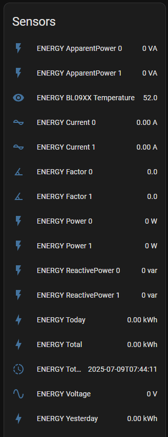 And there it is – in the sensors – “Energy BL09xx Temperature” 52. So that’ll be 52c off-load – at some point I’ll put something near the limit for load on this device and see what the temperature is. As Tasmota RULES have not been used on this device (as far as I can tell), then adding a rule to turn the power off if the chip temperature is above X would be good. It’s just a case of finding out what X should be.